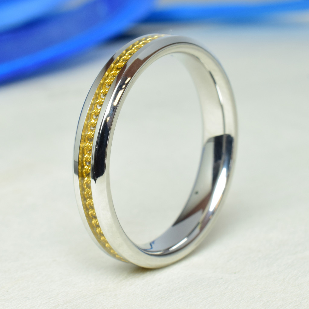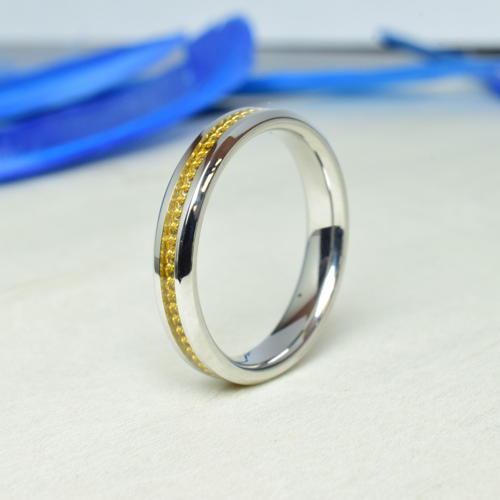 A bemutatott karikagyűrűt Nemesacél és 18 karátos sárga aranyozott láncszemekkel készítettük el ezt a nagyszerű gyűrűt. Letisztult formavilág, kis aprólékos díszítéssel.
