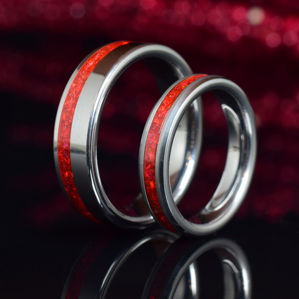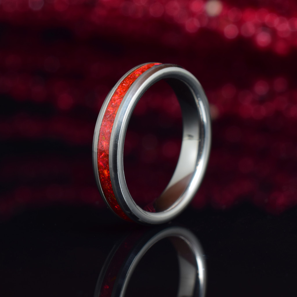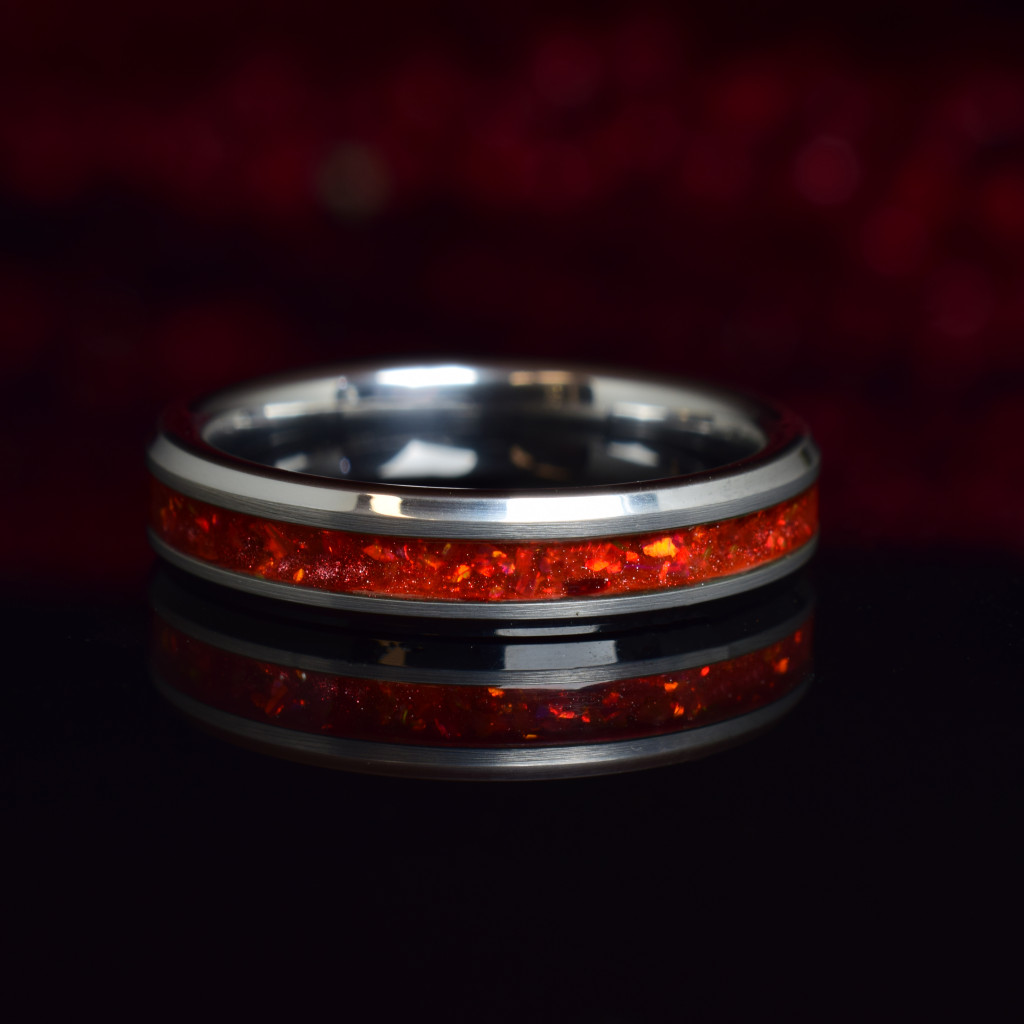 A fentebb látható gyűrű wolfram-karbidból készült. Berakása pedig Tűzvörös opál és metál pigment keveréke. Célunk volt, hogy a lehető legjobban hasonlítson az izzó lávára. Felülete egy speciális réteggel ellátott, ami ellenáll a mindennapos használatnak és megvédi a víztől!
