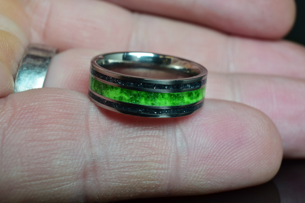 Titanium Wedding Ring with Green Emerald & Aurora Green Glow with Antimonite crystal sides